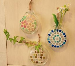 吹きガラス工房で手作りされたかべ掛けの一輪ざしの表面を、ガラスモザイクで仕上げます。大人の方にも是非体験していただきたい作品です。