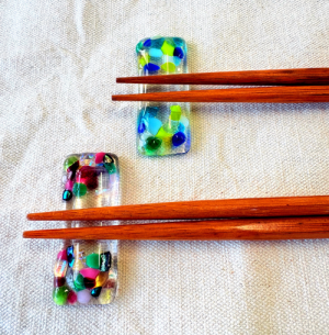 色や形が様々なガラスを組み合わせ、熱を加えて溶かし合わせることで、小物やアクセサリーを作る技法です。はし置き2個またはアクセサリー1個お作りいただけます。※制作した作品はお預かりして窯で焼成するので、当日お持ち帰りはできません。