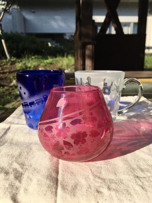 ガラスの表面に高圧で砂を吹きつけて削り、模様を描く技法です。コップやペーパーウェイトなどのガラス素材にデザインシールや文字の切り抜きを貼り、高圧で砂を吹き付けることで表面が研磨され、模様を描くことができます。シールをはがせる年齢のお子様から大人までお楽しみいただけます。