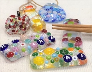 色や形が様々なガラスを組み合わせ、熱を加えて溶かし合わせることで、小物やアクセサリーを作る技法です。はし置き2個またはアクセサリー1個お作りいただけます。※制作した作品はお預かりして窯で焼成するので、当日お持ち帰りはできません。