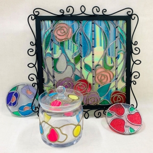 3月は桜色のガラスの上に色とりどりのガラスをお好みの形にカットしてならべ、焼成します。