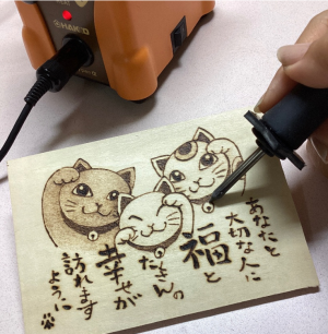 電熱ペンで木の素材を焦がして絵や模様を描く技法です。木が焦げる香りとセピア色の温もりあふれる仕上がりに心癒されます♪材料は端材を使用。下絵をなぞって描くこともできるので、絵が苦手な方や初めての方でも安心してお楽しみいただけます。
