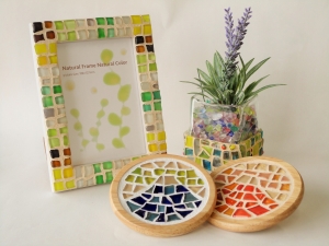色や形が様々なガラスタイルで自分だけのモザイク作品を作ります。