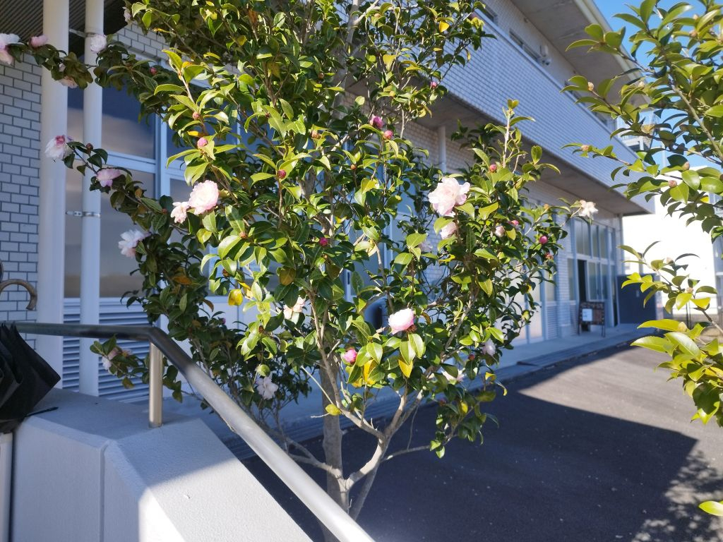 白い花が咲くさざんかと薄桃色の花が咲くものがありますがこちらは薄桃色の花です。